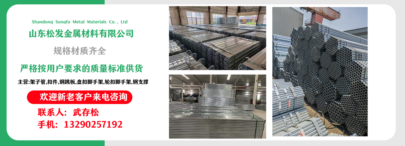 山東松發(fā)金屬材料有限公司主營架子管,扣件,鋼跳板,盤扣腳手架,輪扣腳手架,鋼支撐生產(chǎn)廠家。本廠專業(yè)生產(chǎn)銷售?! 〗ㄖ眉茏庸?、 主要用于房建,橋梁,鐵路,公路,地鐵,水庫,隧道,支撐?! 〖茏庸?扣件,鋼跳板,盤扣腳手架,輪扣腳手架,鋼支撐的優(yōu)越性及應(yīng)用“ ”產(chǎn)品因具有結(jié)構(gòu)簡單合理、設(shè)計巧妙、使用方便、安全、快捷、易于運輸、儲存、維護(hù)簡單等特點。 公司一貫堅持“質(zhì)量,用戶至上,優(yōu)質(zhì)服務(wù),信守合同”的宗旨,憑借著高質(zhì)量的產(chǎn)品,良好的信譽,優(yōu)質(zhì)的服務(wù),產(chǎn)品暢銷全球。歡迎廣大客戶來電洽談,共同發(fā)展,共創(chuàng)輝煌! 山東松發(fā)金屬材料有限公司秉承誠信服務(wù)、恪守信譽的宗旨,在同等的質(zhì)量下,保證以最低的價格,最完善的服務(wù),最高的信譽來答謝各界朋友的支持和厚愛,歡迎您的來電、咨詢,我們將竭誠為您服務(wù)!...